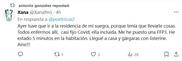 VISITANDO EL MATADERO Ayer tuve que ir a la residencia de mi suegra, porque tenía que llevarle cosas. Todos enfermos allí, casi fijo Covid, ella incluida. Me he puesto una FFP3. He estado 5 minutos en la habitación. Llegué a casa y gárgaras con listerine. Ains!!!
