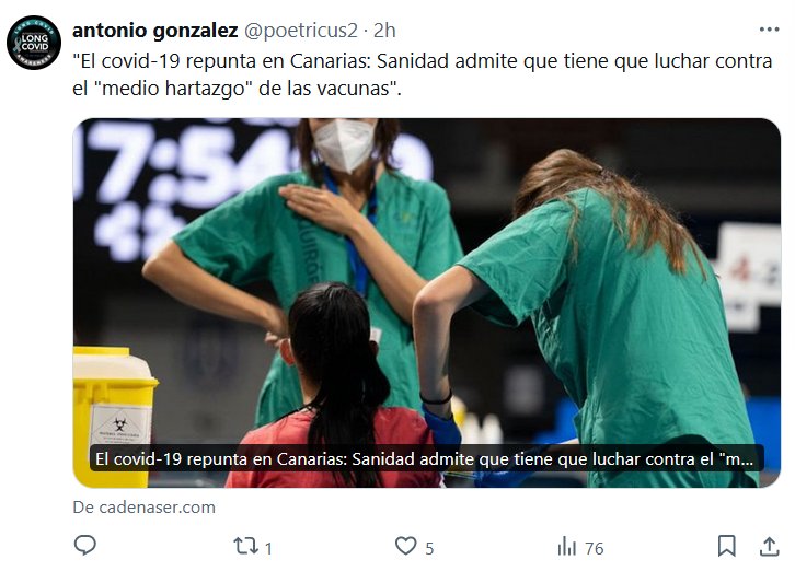 SE HARTAN DE LA VACUNAS Y NO DEL 5º AÑO DE COVID!!! «El covid-19 repunta en Canarias: Sanidad admite que tiene que luchar contra el «medio hartazgo» de las vacunas» Posted on junio 19, 2024 por coronado https://cadenaser.com/canarias/2024/06/19/el-covid-19-repunta-en-canarias-sanidad-admite-que-tiene-que-luchar-contra-el-hartazgo-a-las-vacunas-radio-club-tenerife/