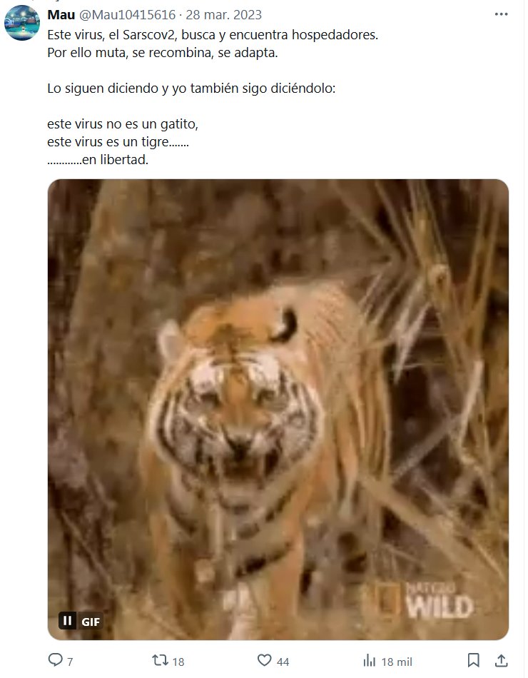 Este virus, el Sarscov2, busca y encuentra hospedadores. Por ello muta, se recombina, se adapta. Lo siguen diciendo y yo también sigo diciéndolo: este virus no es un gatito, este virus es un tigre……. …………en libertad