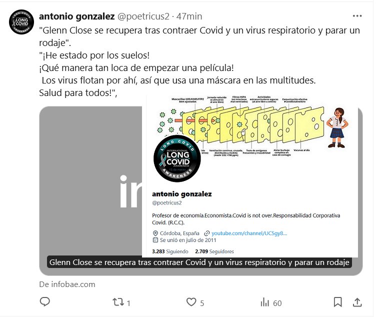OTRO MENSAJE EN UNA BOTELLA ARROJADA LA MAR «Glenn Close se recupera tras contraer Covid y un virus respiratorio y parar un rodaje». «¡He estado por los suelos! ¡Qué manera tan loca de empezar una película! Los virus flotan por ahí, así que usa una máscara en las multitudes. Salud para todos!»