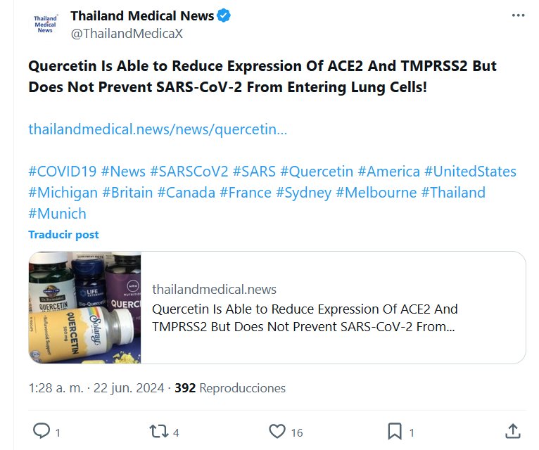 ¡La quercetina puede reducir la expresión de ACE2 y TMPRSS2 pero no evita que el SARS-CoV-2 ingrese a las células pulmonares! Posted on junio 22, 2024 por coronado https://www.thailandmedical.news/news/quercetin-is-able-to-reduce-expression-of-ace2-and-tmprss2-but-does-not-prevent-sars-cov-2-from-entering-lung-cells