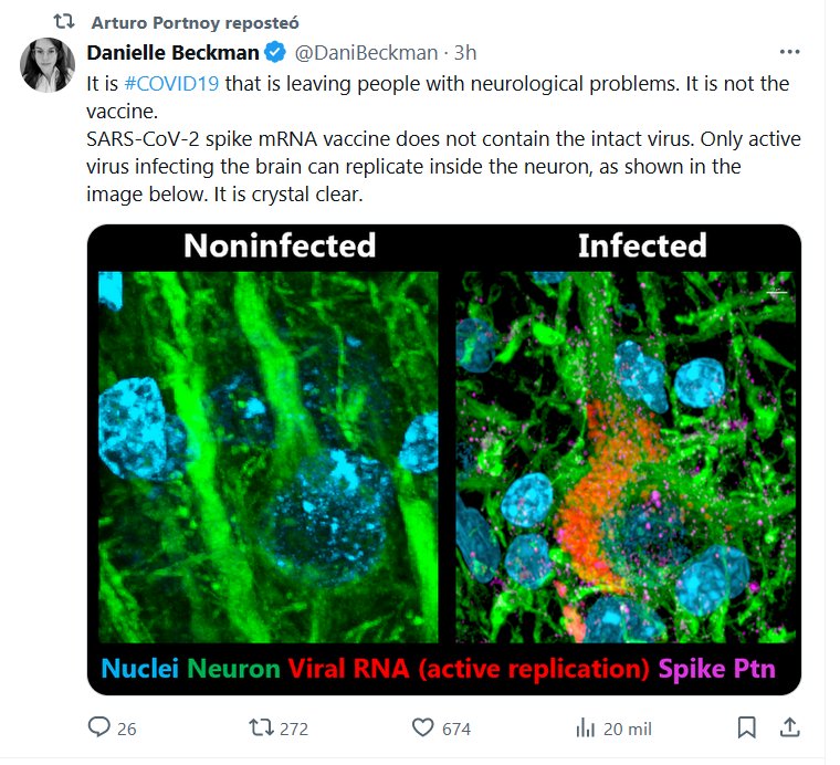 EN INGLÉS Es el #COVID19 el que está dejando a las personas con problemas neurológicos. No es la vacuna. La vacuna de ARNm contra el SARS-CoV-2 no contiene el virus intacto. Sólo el virus activo que infecta el cerebro puede replicarse dentro de la neurona, como se muestra en la imagen siguiente. Es muy claro.