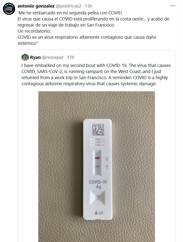 ‘Me he embarcado en mi segunda pelea con COVID. El virus que causa el COVID está proliferando en la costa oeste… y acabo de regresar de un viaje de trabajo en San Francisco. Un recordatorio: COVID es un virus respiratorio altamente contagioso que causa daño sistémico»