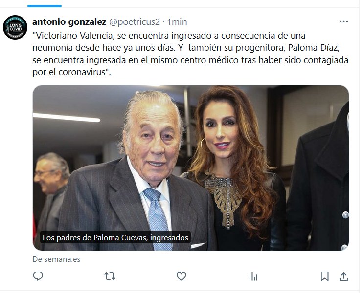 NO ERA QUE NO HABÍA? «Victoriano Valencia, se encuentra ingresado a consecuencia de una neumonía desde hace ya unos días. Y también su progenitora, Paloma Díaz, se encuentra ingresada en el mismo centro médico tras haber sido contagiada por el coronavirus»