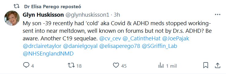 TESTIMONIOS (EN INGLÉS) Mi hijo, de 39 años, recientemente tuvo un «resfriado», también conocido como Covid y los medicamentos para el TDAH dejaron de funcionar, casi se derrumbó, muy conocido en los foros, pero no por los Dr.s. ¿TDAH? Tenga en cuenta. Otra secuela del C19.