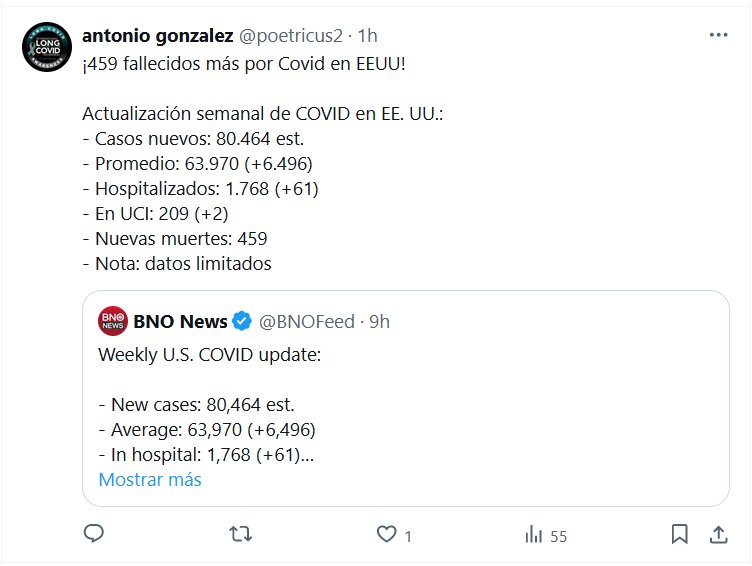 TODO EL AÑO! ¡459 fallecidos más por Covid en EEUU! Actualización semanal de COVID en EE. UU.: – Casos nuevos: 80.464 est. – Promedio: 63.970 (+6.496) – Hospitalizados: 1.768 (+61) – En UCI: 209 (+2) – Nuevas muertes: 459 – Nota: datos limitados