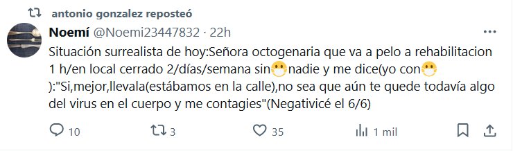 OQUEDAD CRANEAL: «A MI NO ME VA A PASAR PROQUE SOY YO» Situación surrealista de hoy:Señora octogenaria que va a pelo a rehabilitacion 1 h/en local cerrado 2/días/semana sin😷nadie y me dice(yo con😷):»Si,mejor,llevala(estábamos en la calle),no sea que aún te quede todavía algo del virus en el cuerpo y me contagies»