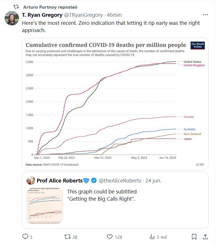 GRÁFICO MUERTES COVID (EN INGLÉS) T.Ryan Gregory @TRyanGregory · Aquí está el más reciente. No hay indicios de que dejarlo estallar temprano fuera el enfoque correcto. Posted on junio 26, 2024 por coronado https://x.com/theAliceRoberts/status/1805351416799838287