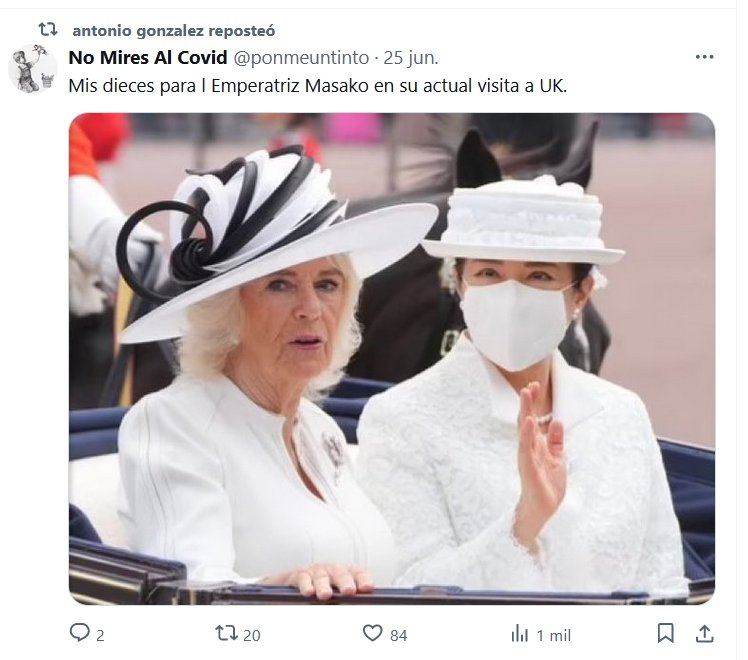 SABIDURÍA ORIENTAL CON MASCARILLA No Mires Al Covid @ponmeuntinto · 25 jun. Mis dieces para l Emperatriz Masako en su actual visita a UK. Posted on junio 26, 2024 por coronado