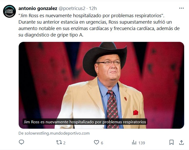 NODIGAMOSCOVID HACE ESTRAGOS «Jim Ross es nuevamente hospitalizado por problemas respiratorios». Durante su anterior estancia en urgencias, Ross supuestamente sufrió un aumento notable en sus enzimas cardíacas y frecuencia cardíaca, además de su diagnóstico de gripe tipo A