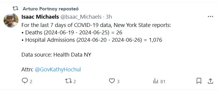 EN INGLÉS Para los últimos 7 días de datos de COVID-19, el estado de Nueva York informa: • Muertes (2024-06-19 – 2024-06-25) = 26 • Ingresos Hospitalarios (2024-06-20 – 2024-06-26) = 1,076 Fuente de datos: Datos de salud NY A la atención de: @GovKathyHochul