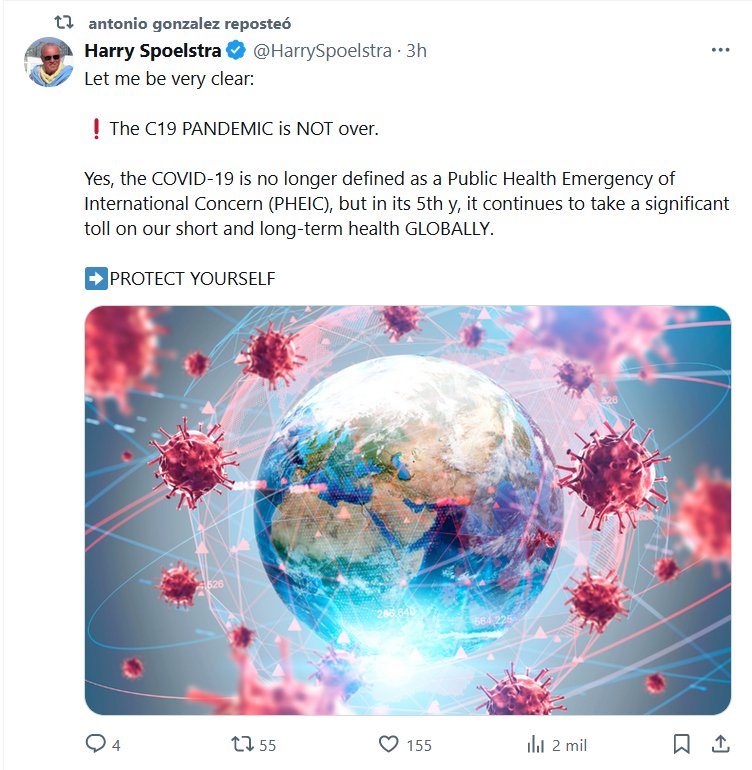 FUERTE Y CLARO (EN INGLÉS) Déjame ser muy claro: ❗La PANDEMIA C19 NO ha terminado. Sí, el COVID-19 ya no se define como una Emergencia de Salud Pública de Importancia Internacional (ESPII), pero en su quinto año, continúa cobrando un precio significativo en nuestra salud a corto y largo plazo A NIVEL MUNDIAL. ➡️PROTEGETE