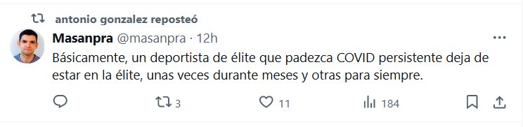 Básicamente, un deportista de élite que padezca COVID persistente deja de estar en la élite, unas veces durante meses y otras para siempre. Posted on junio 29, 2024 por coronado "La verdad lo vence todo"