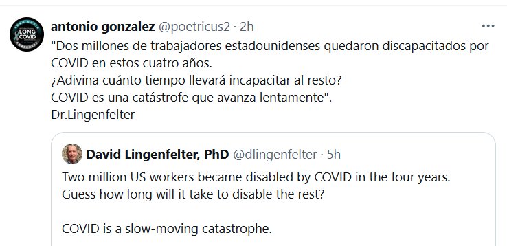 «Dos millones de trabajadores estadounidenses quedaron discapacitados por COVID en estos cuatro años. ¿Adivina cuánto tiempo llevará incapacitar al resto? COVID es una catástrofe que avanza lentamente». Dr.Lingenfelter