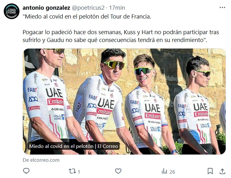 «Miedo al covid en el pelotón del Tour de Francia. Pogacar lo padeció hace dos semanas, Kuss y Hart no podrán participar tras sufrirlo y Gaudu no sabe qué consecuencias tendrá en su rendimiento».