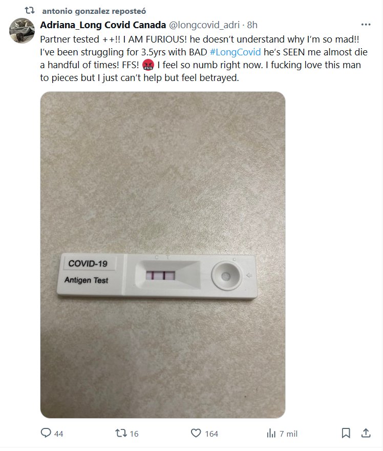 TESTIMONIOS (EN INGLÉS) Adriana_Long Covid Canadá @longcovid_adri ¡¡¡Compañero: prueba ++!!! Estoy furiosA! él no entiende por qué estoy tan locA! ¡Llevo 3.5 AÑOS luchando con UN MAL #LongCovid , me ha VISTO casi morir un puñado de veces! ¡FFS! Me siento tan entumecidA en este momento
