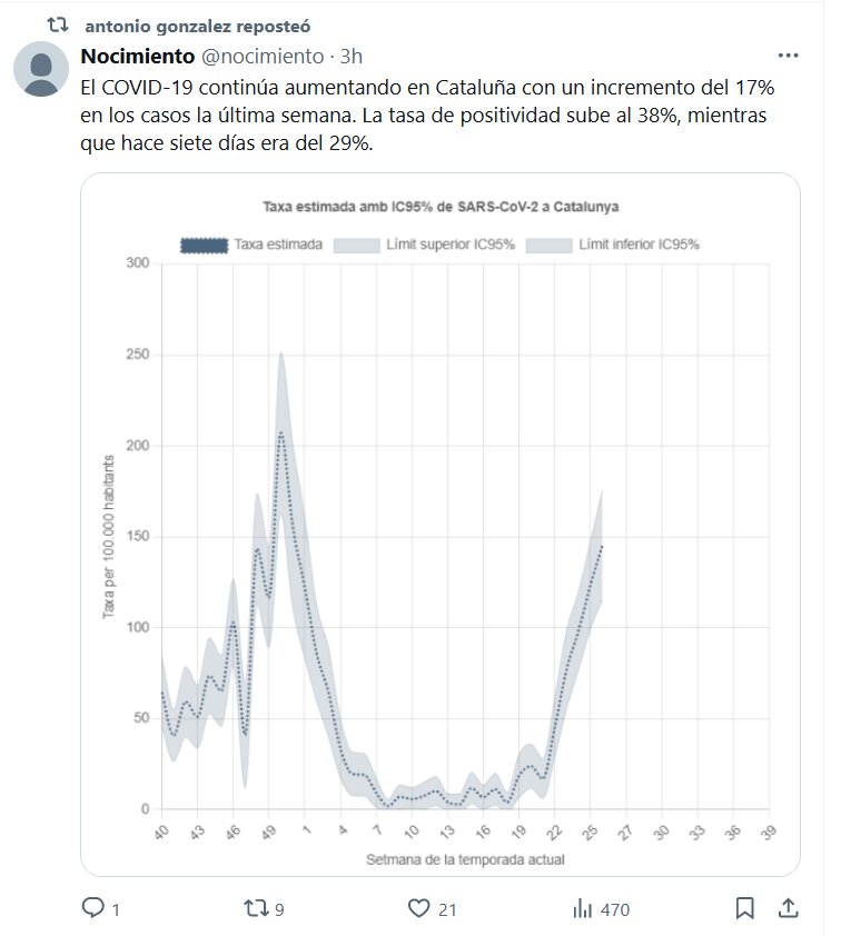 El COVID-19 continúa aumentando en Cataluña con un incremento del 17% en los casos la última semana. La tasa de positividad sube al 38%, mientras que hace siete días era del 29% Posted on julio 2, 2024 por coronado