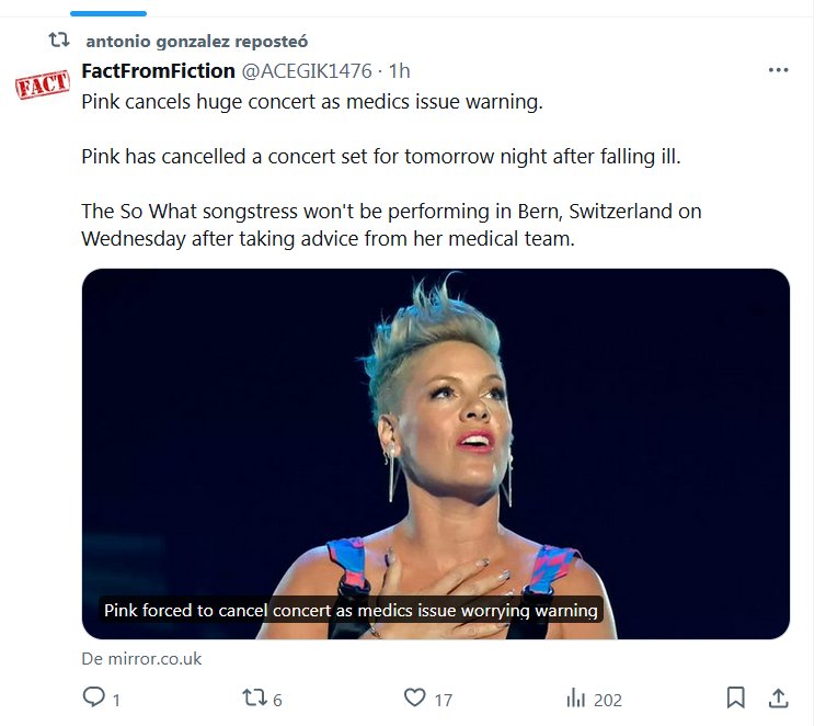NODIGAMOSCOVID SIGUE HACIENDO ESTRAGOS Pink cancela un gran concierto mientras los médicos emiten una advertencia. Pink ha cancelado un concierto programado para mañana por la noche después de enfermarse. La cantante de So What no actuará en Berna, Suiza, el miércoles después de seguir el consejo de su equipo médico.