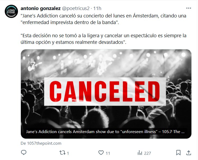NODIGAMOSCOVID SIGUE HACIENDO ESTRAGOS «Jane’s Addiction canceló su concierto del lunes en Ámsterdam, citando una «enfermedad imprevista dentro de la banda». «Esta decisión no se tomó a la ligera y cancelar un espectáculo es siempre la última opción y estamos realmente devastados».