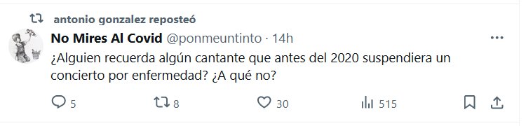 No Mires Al Covid @ponmeuntinto · ¿Alguien recuerda algún cantante que antes del 2020 suspendiera un concierto por enfermedad? ¿A qué no?