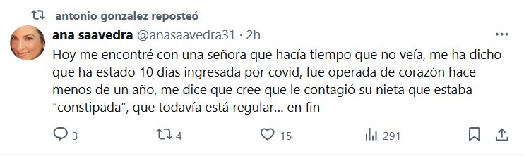 TESTIMONIOS Hoy me encontré con una señora que hacía tiempo que no veía, me ha dicho que ha estado 10 dias ingresada por covid, fue operada de corazón hace menos de un año, me dice que cree que le contagió su nieta que estaba “constipada”, que todavía está regular… en fin