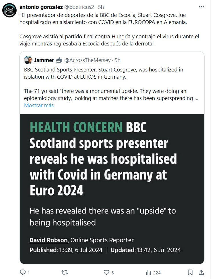 «El presentador de deportes de la BBC de Escocia, Stuart Cosgrove, fue hospitalizado en aislamiento con COVID en la EUROCOPA en Alemania. Cosgrove asistió al partido final contra Hungría y contrajo el virus durante el viaje mientras regresaba a Escocia después de la derrota»