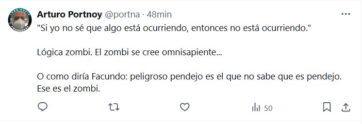 «Si yo no sé que algo está ocurriendo, entonces no está ocurriendo.» Lógica zombi. El zombi se cree omnisapiente… O como diría Facundo: peligroso pendejo es el que no sabe que es pendejo. Ese es el zombi.