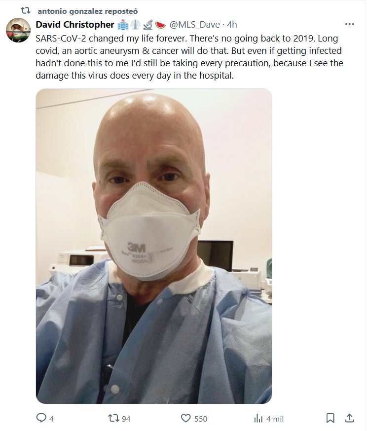 TESTIMONIOS (EN INGLÉS) El SARS-CoV-2 cambió mi vida para siempre. No hay vuelta atrás a 2019. El covid prolongado, un aneurisma aórtico y un cáncer harán eso. Pero incluso si infectarme no me hubiera hecho esto, todavía estaría tomando todas las precauciones, porque veo el daño que este virus hace todos los días en el hospital.