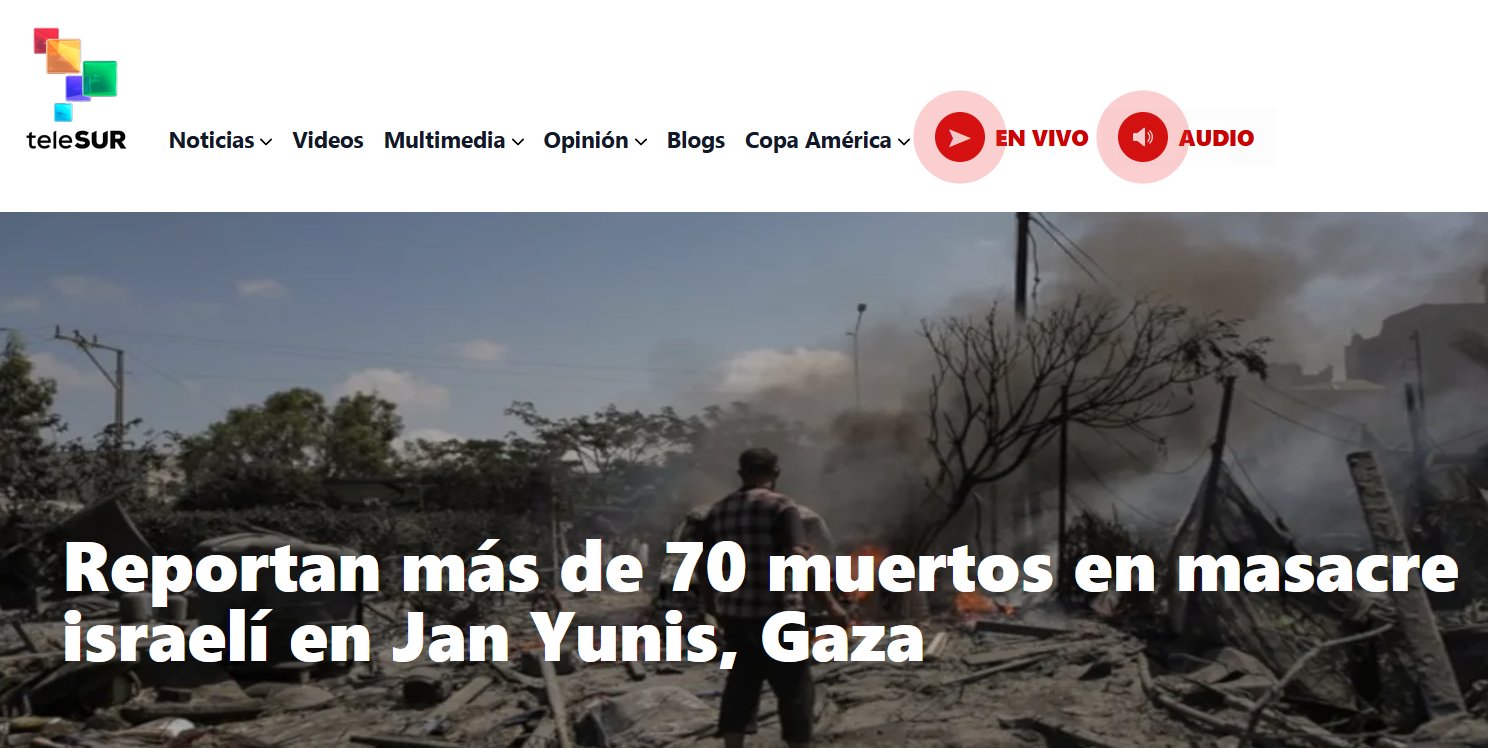 COVID NO ES SU ÚNICA ARMA Reportan más de 70 muertos en masacre israelí en Jan Yunis, Gaza Posted on julio 13, 2024 por coronado https://www.telesurtv.net/reportan-mas-de-70-muertos-en-masacre-israeli-en-jan-yunis-gaza/