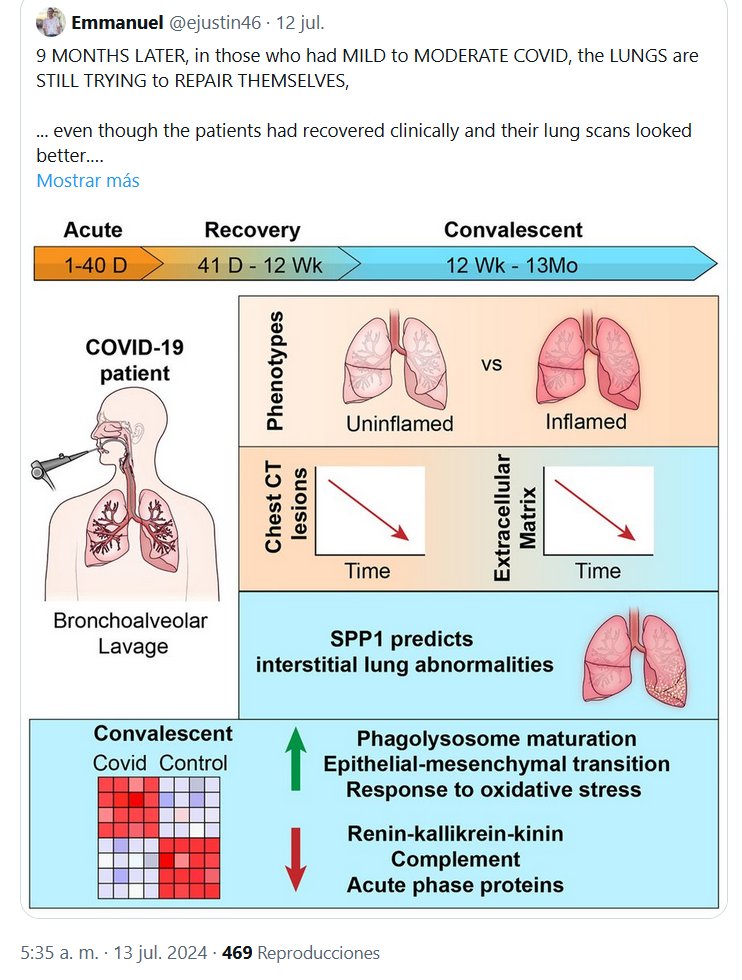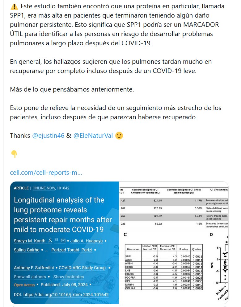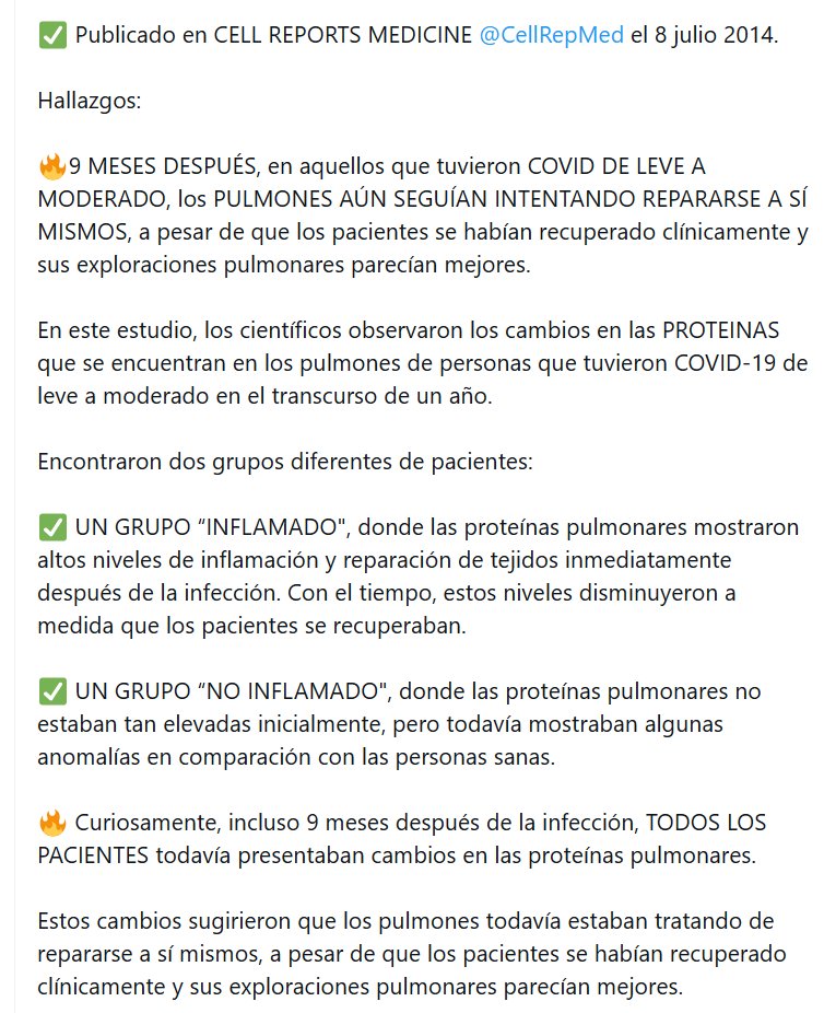 Hallazgos: 🔥9 MESES DESPUÉS, en aquellos que tuvieron COVID DE LEVE A MODERADO, los PULMONES AÚN SEGUÍAN INTENTANDO REPARARSE A SÍ MISMOS, a pesar de que los pacientes se habían recuperado clínicamente y sus exploraciones pulmonares parecían mejores.