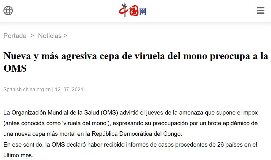 MÁS PLAGAS BÍBLICAS Nueva y más agresiva cepa de viruela del mono preocupa a la OMS Posted on julio 13, 2024 por coronado http://spanish.china.org.cn/txt/2024-07/12/content_117304543.htm
