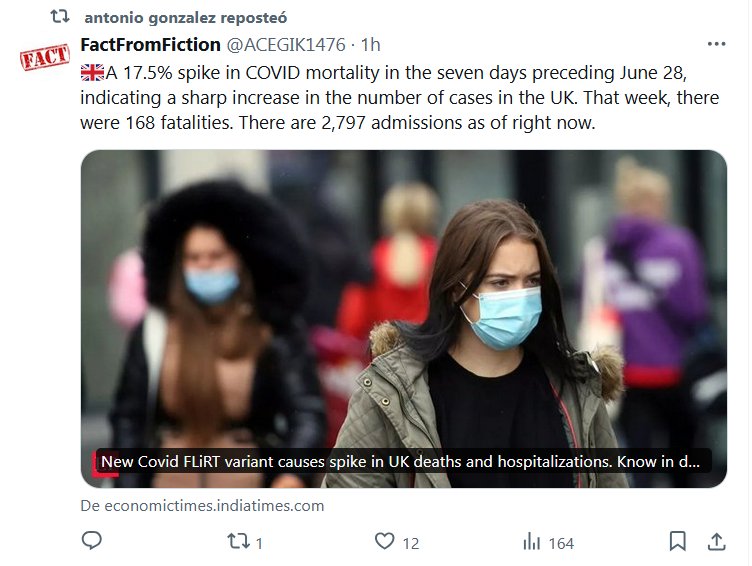 🇬🇧Un aumento del 17,5 % en la mortalidad por COVID en los siete días anteriores al 28 de junio, lo que indica un marcado aumento en el número de casos en el Reino Unido. Esa semana, hubo 168 muertes. Hay 2797 ingresos hasta el momento