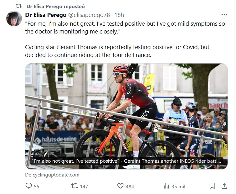 EN INGLÉS Dra. Elisa Perego @elisaperego78 «En mi caso, tampoco me encuentro muy bien. He dado positivo, pero tengo síntomas leves, así que el médico me está vigilando de cerca». La estrella del ciclismo Geraint Thomas habría dado positivo por Covid, pero decidió seguir compitiendo en el Tour de Francia.