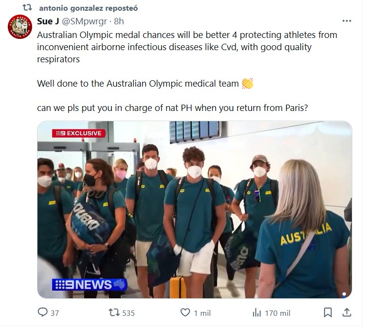 EN INGLÉS Las posibilidades de medalla olímpica australiana serán mejores PARA proteger a los atletas de enfermedades infecciosas transmitidas por el aire como el Cvd (COVID), con respiradores de buena calidad Enhorabuena al equipo médico olímpico australiano 👏