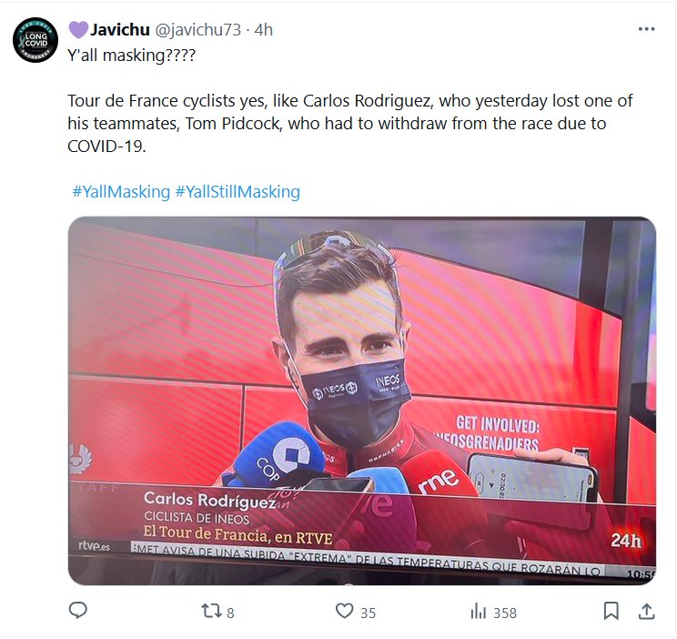 EN INGLÉS ¿Todos se enmascaran? Ciclistas del Tour de Francia, sí, como Carlos Rodríguez, que ayer perdió a uno de sus compañeros de equipo, Tom Pidcock, que tuvo que retirarse de la carrera debido al COVID-19. #YallMasking #YallStillMasking