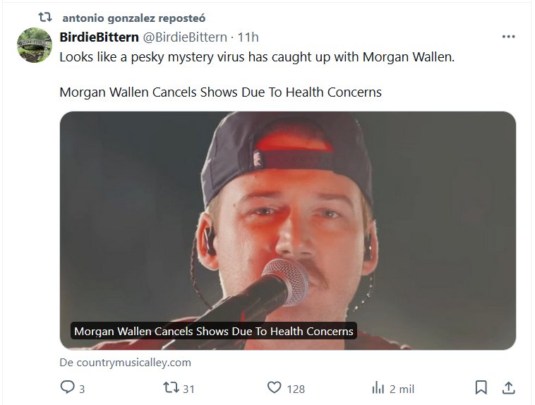 NODIGAMOSCOVID HACE ESTRAGOS (EN INGLÉS) Parece que un molesto y misterioso virus ha atrapado a Morgan Wallen. Morgan Wallen cancela shows debido a problemas de salud Posted on julio 14, 2024 por coronado