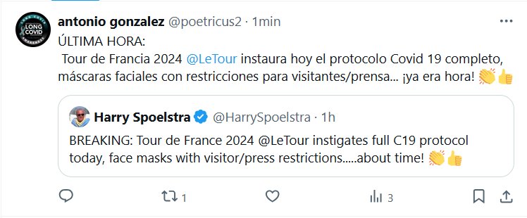 Y EL FIN DE PANDEMIA??? ÚLTIMA HORA: Tour de Francia 2024 @LeTour instaura hoy el protocolo Covid 19 completo, máscaras faciales con restricciones para visitantes/prensa… ¡ya era hora! 👏👍 Posted on julio 14, 2024 por coronado
