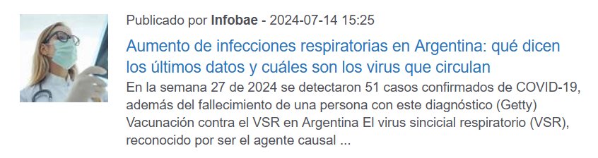 ARGENTINA En la semana 27 de 2024 se detectaron 51 casos confirmados de COVID-19, además del fallecimiento de una persona con este diagnóstico Posted on julio 15, 2024 por coronado https://www.infobae.com/salud/2024/07/14/aumento-de-infecciones-respiratorias-en-argentina-que-dicen-los-ultimos-datos-y-cuales-son-los-virus-que-circulan/
