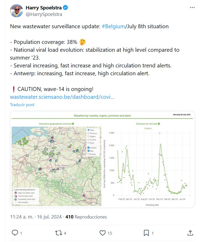 EN INGLÉS Nueva actualización de la vigilancia de las aguas residuales: #Bélgica/situación del 8 de julio – Cobertura poblacional: 38% 🤔 – Evolución de la carga viral nacional: estabilización en nivel alto respecto al verano ’23. – Varias alertas de tendencias crecientes, de rápido aumento y de alta circulación. – Amberes: en aumento, rápido aumento, alerta de circulación alta. ❗¡PRECAUCIÓN, la ola 14 está en curso!