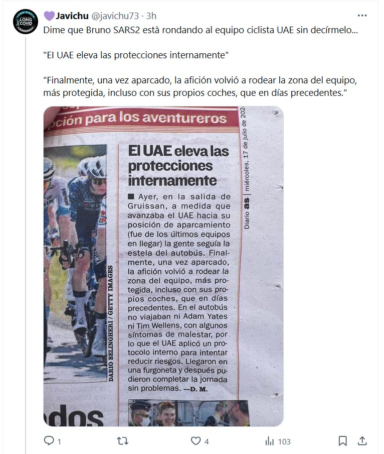 COVID ES PARA TI, NO PARA ELLOS Dime que Bruno SARS2 està rondando al equipo ciclista UAE sin decírmelo… «EI UAE eleva las protecciones internamente» «Finalmente, una vez aparcado, la afición volvió a rodear la zona del equipo, más protegida, incluso con sus propios coches, que en días precedentes.»