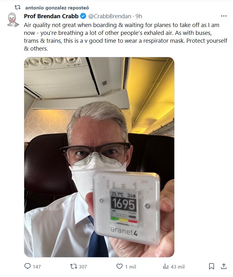 EN INGLÉS La calidad del aire no es muy buena al abordar y esperar a que despeguen los aviones, como estoy ahora; se respira mucho aire exhalado por otras personas. Al igual que con los autobuses, tranvías y trenes, este es un buen momento para usar una mascarilla respiratoria. Protégete a ti mismo y a los demás