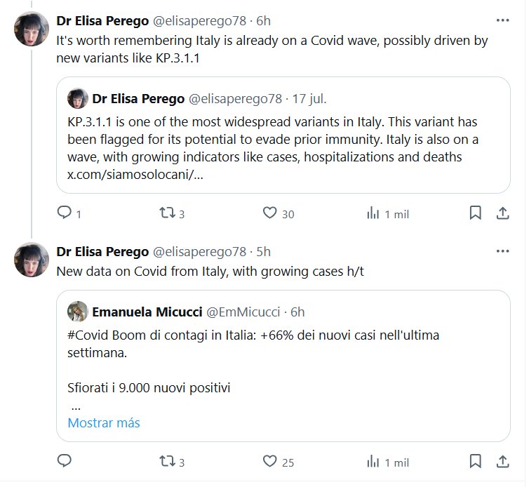 EN INGLÉS Dra. Elisa Perego @elisaperego78 Vale la pena recordar que Italia ya se encuentra en una ola de Covid, posiblemente impulsada por nuevas variantes como KP.3.1.1 Posted on julio 19, 2024 por coronado