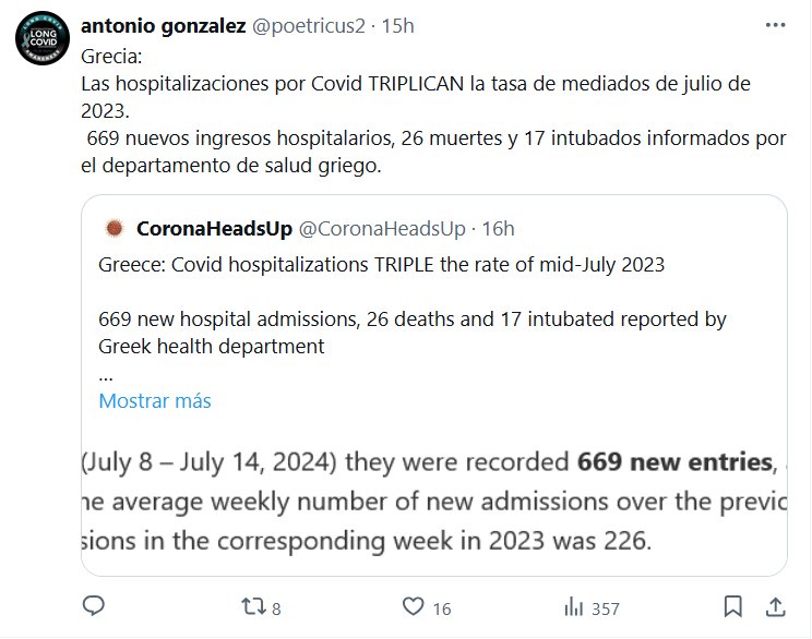 Y EL FIN DE PANDEMIA? Grecia: Las hospitalizaciones por Covid TRIPLICAN la tasa de mediados de julio de 2023. 669 nuevos ingresos hospitalarios, 26 muertes y 17 intubados informados por el departamento de salud griego.