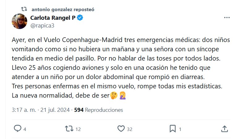 NODIGAMOSCOVID HACE ESTRAGOS Ayer, en el Vuelo Copenhague-Madrid tres emergencias médicas: dos niños vomitando como si no hubiera un mañana y una señora con un síncope tendida en medio del pasillo. Por no hablar de las toses por todos lados. Llevo 25 años cogiendo aviones y solo en una ocasión he tenido que atender a un niño por un dolor abdominal que rompió en diarreas. Tres personas enfermas en el mismo vuelo, rompe todas mis estadísticas. La nueva normalidad, debe de ser🤔🤦♀️