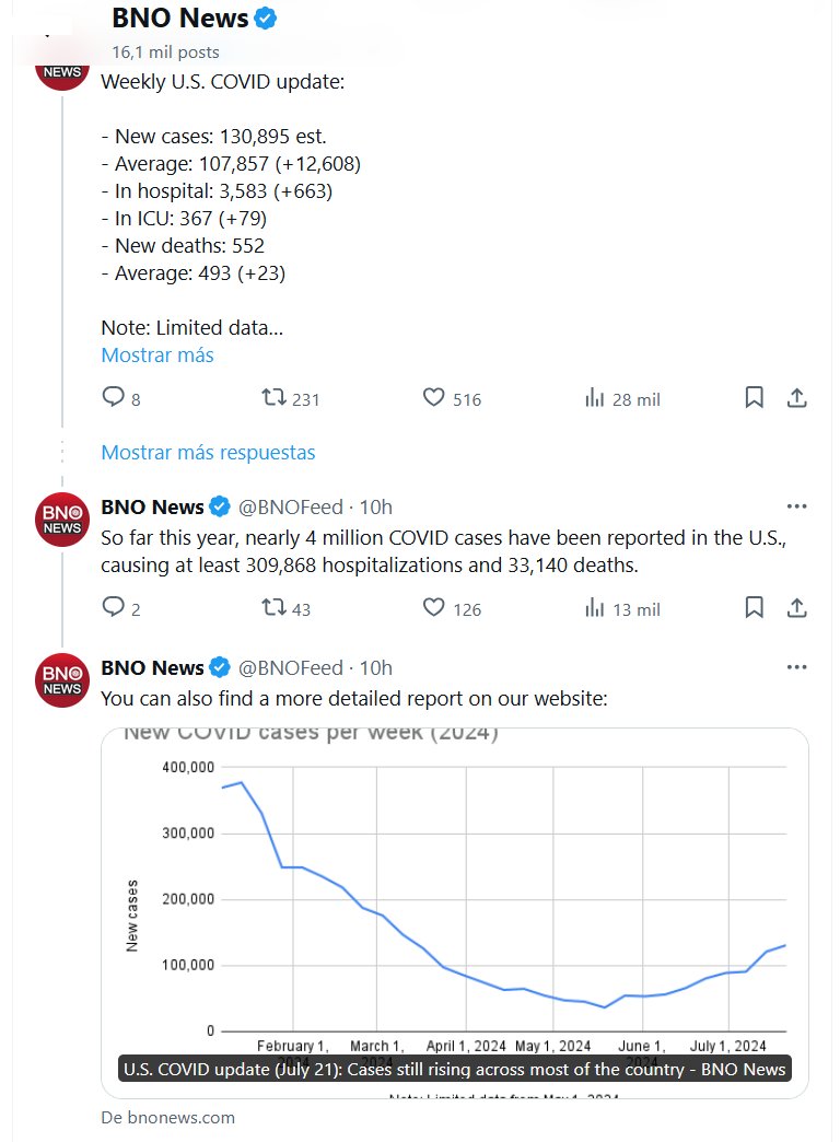 EN INGLÉS Actualización semanal de COVID en EE. UU.: – Casos nuevos: 130.895 est. – Promedio: 107.857 (+12.608) – Hospitalizados: 3.583 (+663) – En UCI: 367 (+79) – Nuevas muertes: 552 – Promedio: 493 (+23) Nota: datos limitados Posted on julio 22, 2024 por coronado