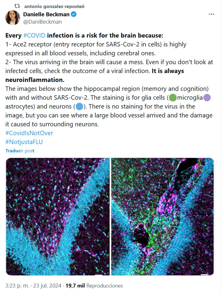 EN INGLÉS Cada infección por #COVID es un riesgo para el cerebro porque: 1- El receptor Ace2 (receptor de entrada del SARS-Cov-2 en las células) se expresa altamente en todos los vasos sanguíneos, incluidos los cerebrales. 2- El virus que llegue al cerebro provocará un desastre. Incluso si no observa las células infectadas, verifique el resultado de una infección viral. Siempre es neuroinflamación.