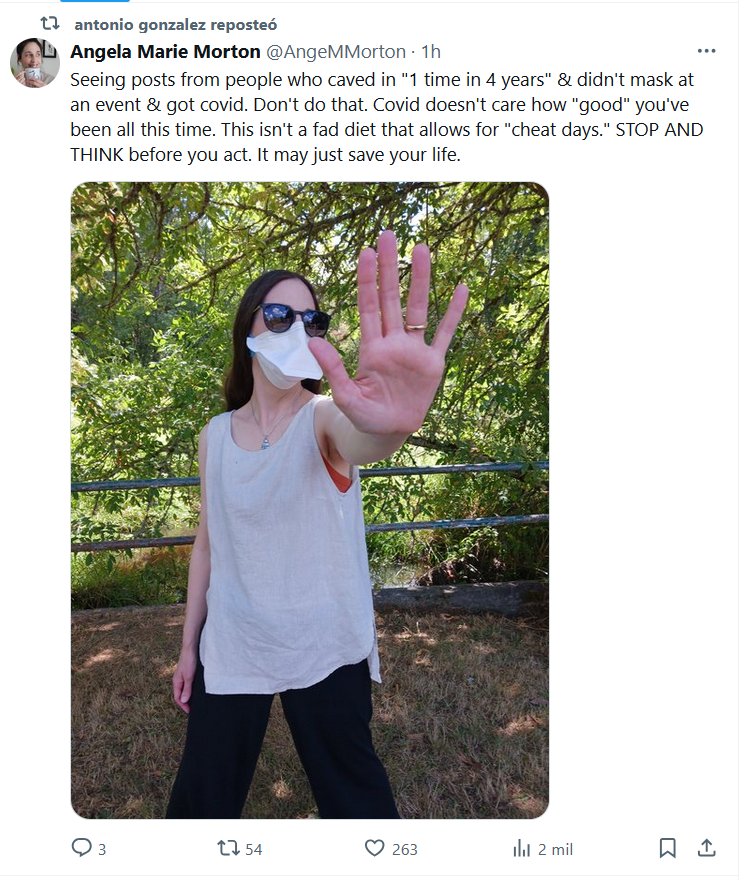EN INGLÉS Ver publicaciones de personas que cedieron «una vez en 4 años» y no usaron mascarilla en un evento y contrajeron covid. No hagas eso. A Covid no le importa lo «bueno» que hayas sido todo este tiempo. Esta no es una dieta de moda que permita «días de trampa». PARE Y PIENSE antes de actuar. Puede que simplemente le salve la vida.