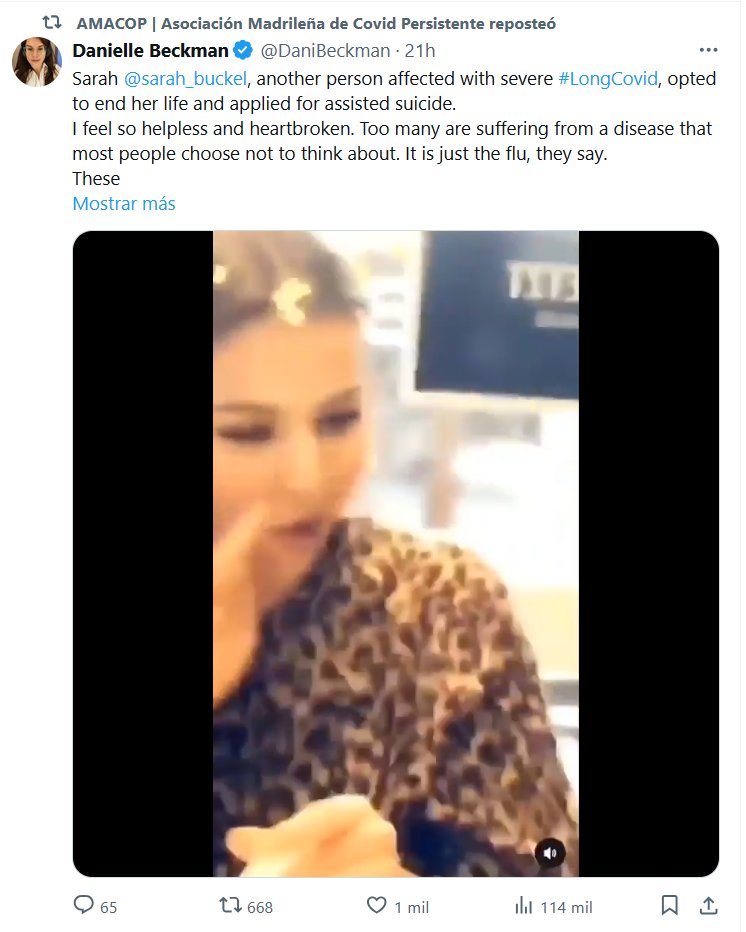 LESA HUMANIDAD (EN INGLÉS) Sarah @sarah_buckel , otra persona afectada con #LongCovid grave, optó por poner fin a su vida y solicitó el suicidio asistido. Me siento tan impotente y desconsolada. Demasiadas personas padecen una enfermedad en la que la mayoría de la gente decide no pensar. Es sólo la gripe, dicen. Estas historias necesitan ser vistas. Ayúdenos a crear conciencia sobre Long Covid.