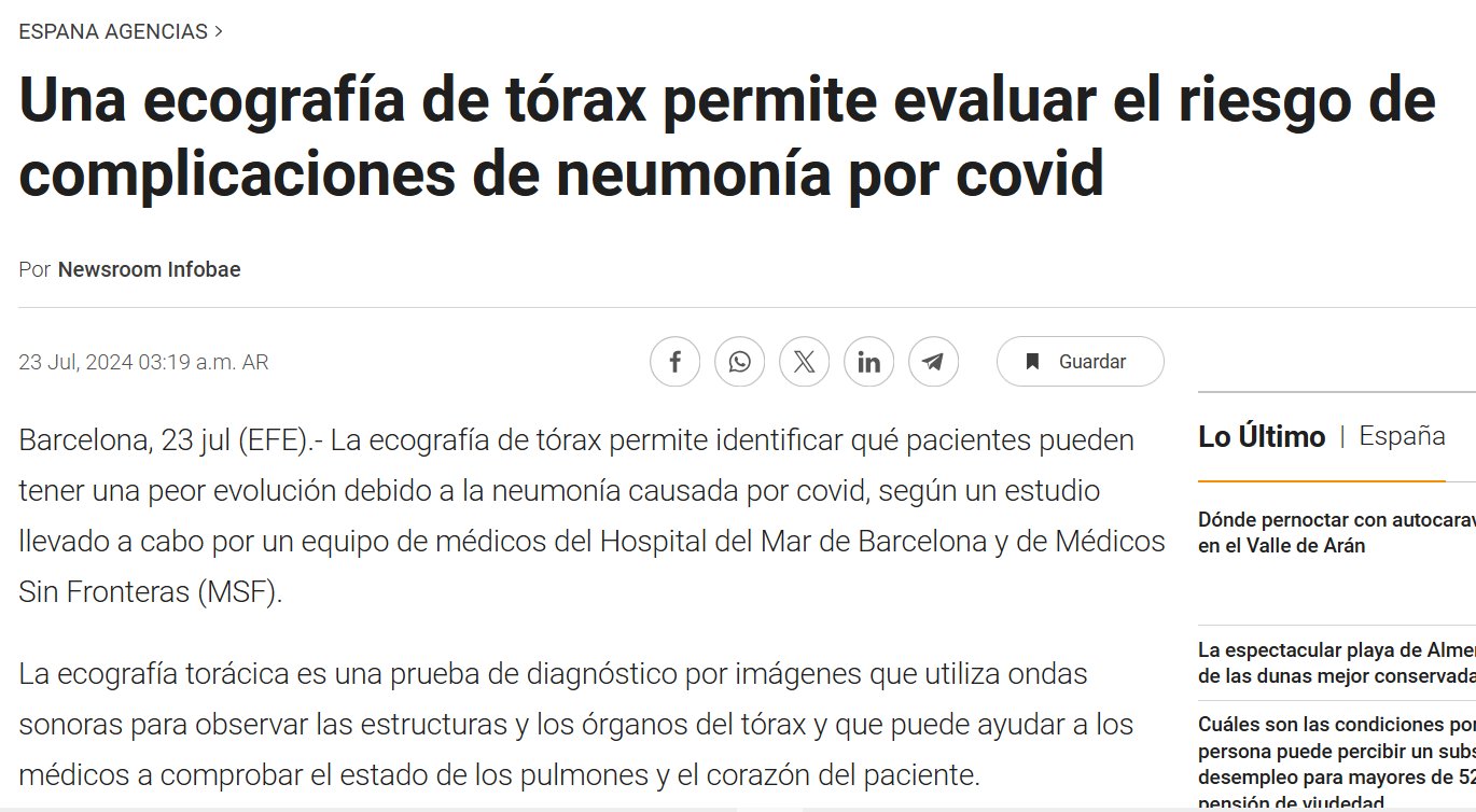 NO ERA LEVE Una ecografía de tórax permite evaluar el riesgo de complicaciones de neumonía por covid Posted on julio 23, 2024 por coronado https://www.infobae.com/espana/agencias/2024/07/23/una-ecografia-de-torax-permite-evaluar-el-riesgo-de-complicaciones-de-neumonia-por-covid/