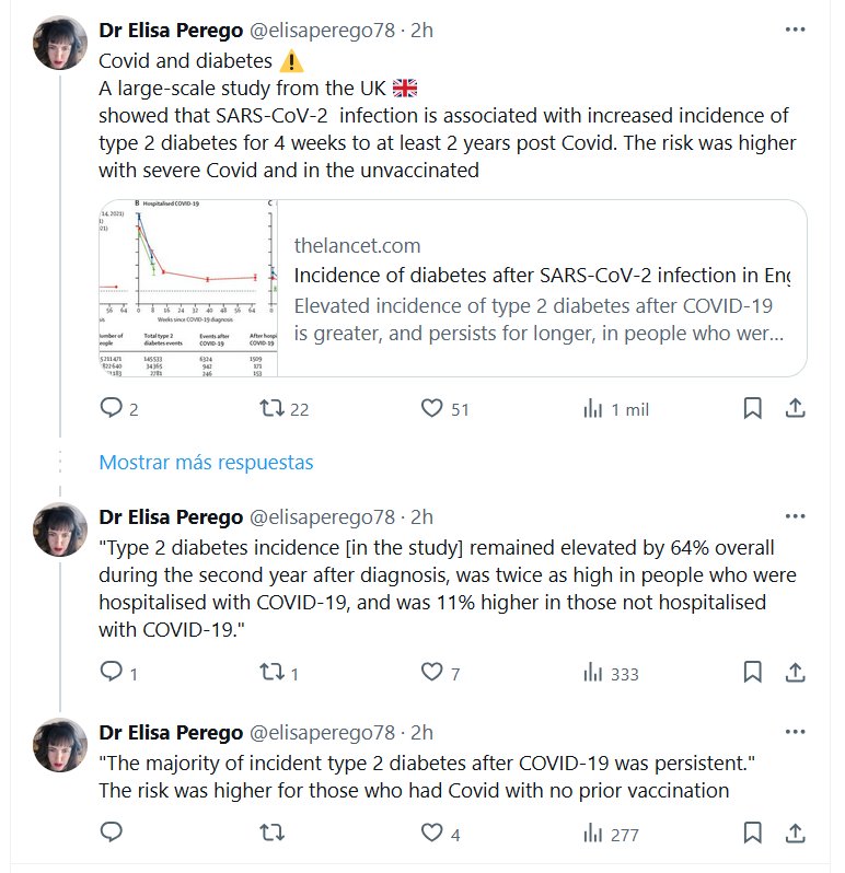 EN INGLÉS Dra. Elisa Perego @elisaperego78 Covid y diabetes ⚠️ Un estudio a gran escala del Reino Unido 🇬🇧 demostró que la infección por SARS-CoV-2 se asocia con una mayor incidencia de diabetes tipo 2 durante 4 semanas hasta al menos 2 años después de Covid. El riesgo era mayor con Covid grave y en los no vacunados.